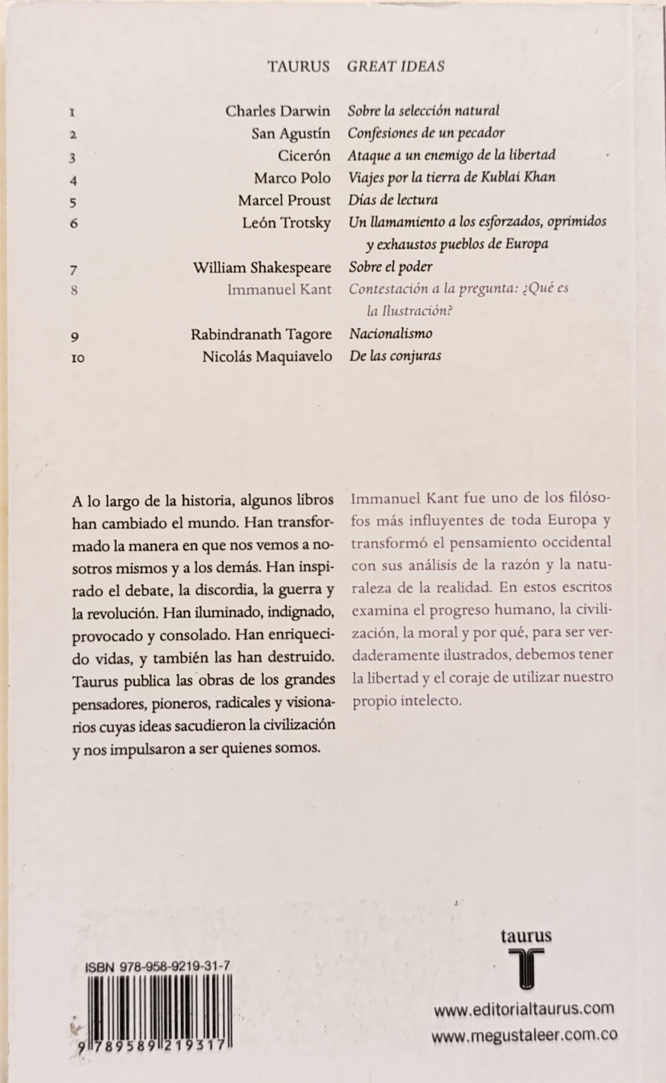 A lo largo de la historia, algunos libros han cambiado el mundo. Han transformado la manera en que nos vemos a nosotros mismos y a los demás. Han inspirado el debate, la discordia, la guerra y la revolución. Han iluminado, indignado, provocado y consolado. Han enriquecido vidas, y también las han destruido. Taurus publica las obras de los grandes pensadores, pioneros, radicales y visionarios cuyas ideas sacudieron la civilización y nos impulsaron a ser quienes somos.