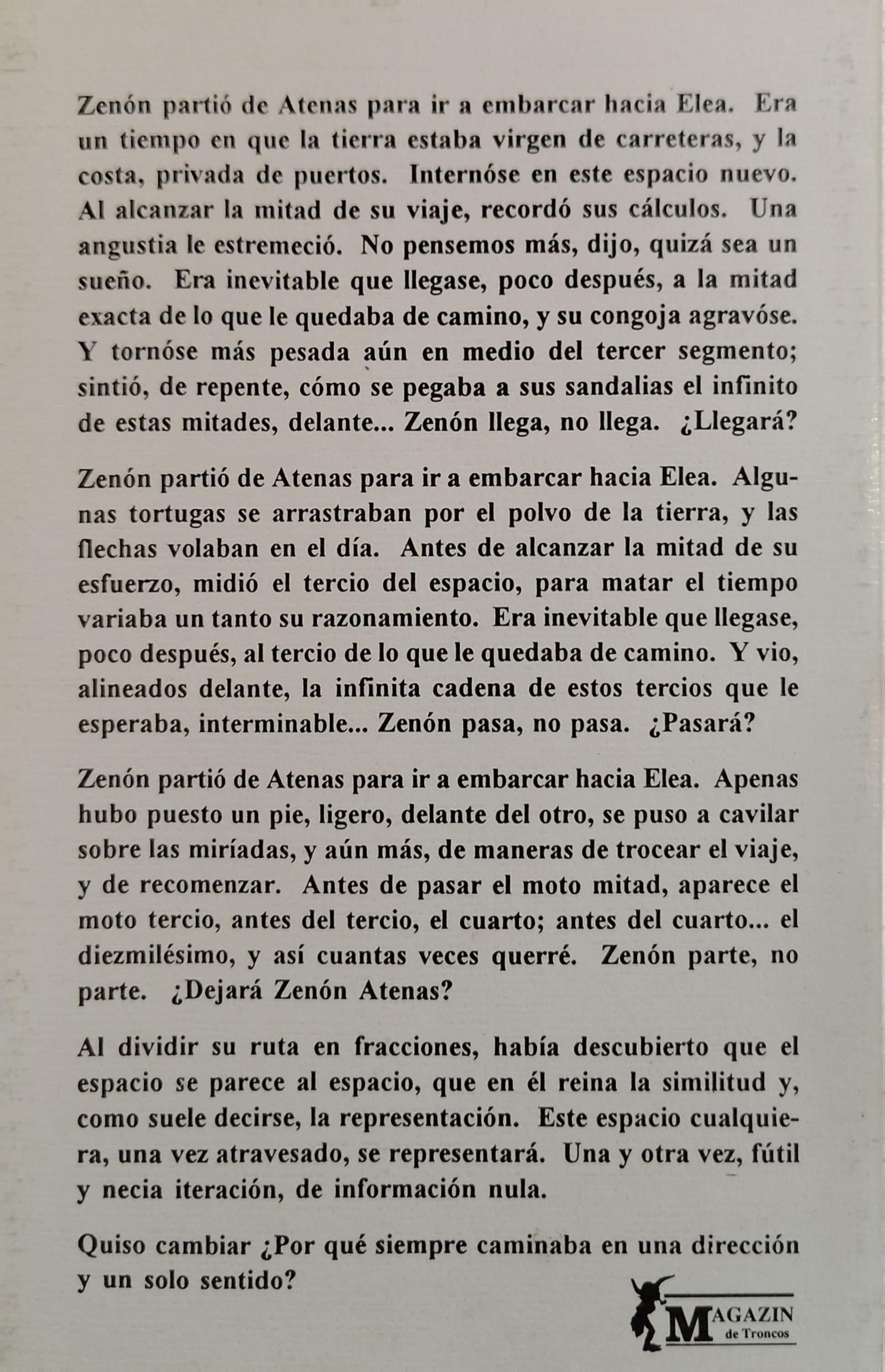 Zenón partió de Atenas para ira embarcar hacia Elea. Era un tiempo en que la tierra estaba virgen de carreteras, y la costa, privada de puertos. Internóse en este espacio nuevo. AI alcanzar la mitad de su viaje, recordó sus cálculos. Una angustia le estremeció. No pensemos más, dijo, quizá sea un sueño. Era inevitable que llegase, poco después, a la mitad exacta de lo que le quedaba de camino, y su congoja agravóse.Y tornóse más pesada aún en medio del tercer segmento; sintió, de repente, cómo se pegaba a sus sandalias el infīnito de estas mitades, delante..Zenón llega, no llega. ¿Llegará?