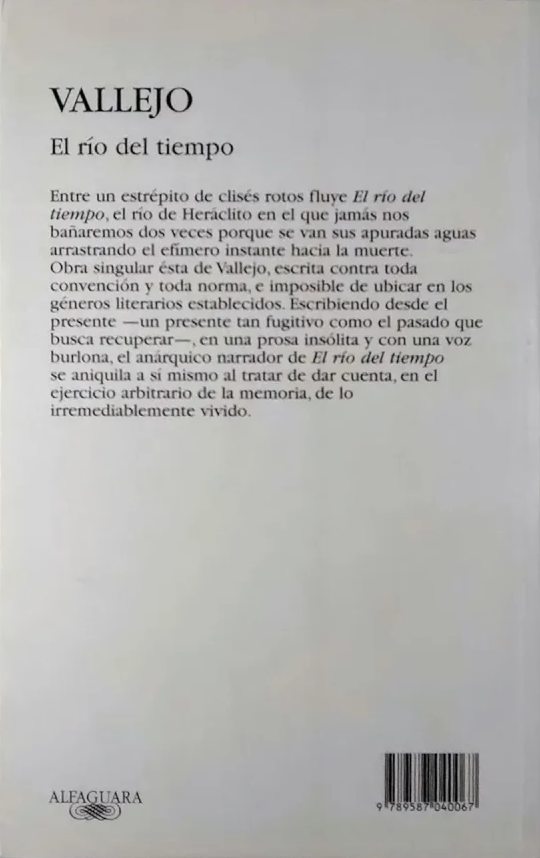 Obra singular ésta de Vallejo, escrita contra toda convención y toda norma, e imposible de ubicar en los géneros literarios establecidos. Escribiendo desde el presente —un presente tan fugitivo como el pasado que busca recuperar —, en una prosa insólita y con una voz burlona, el anárquico narrador de El río del tiempo se aniquila a sí mismo al tratar de dar cuenta, en el ejercicio arbitrario de la memoria, de lo irremediablemente vivido.