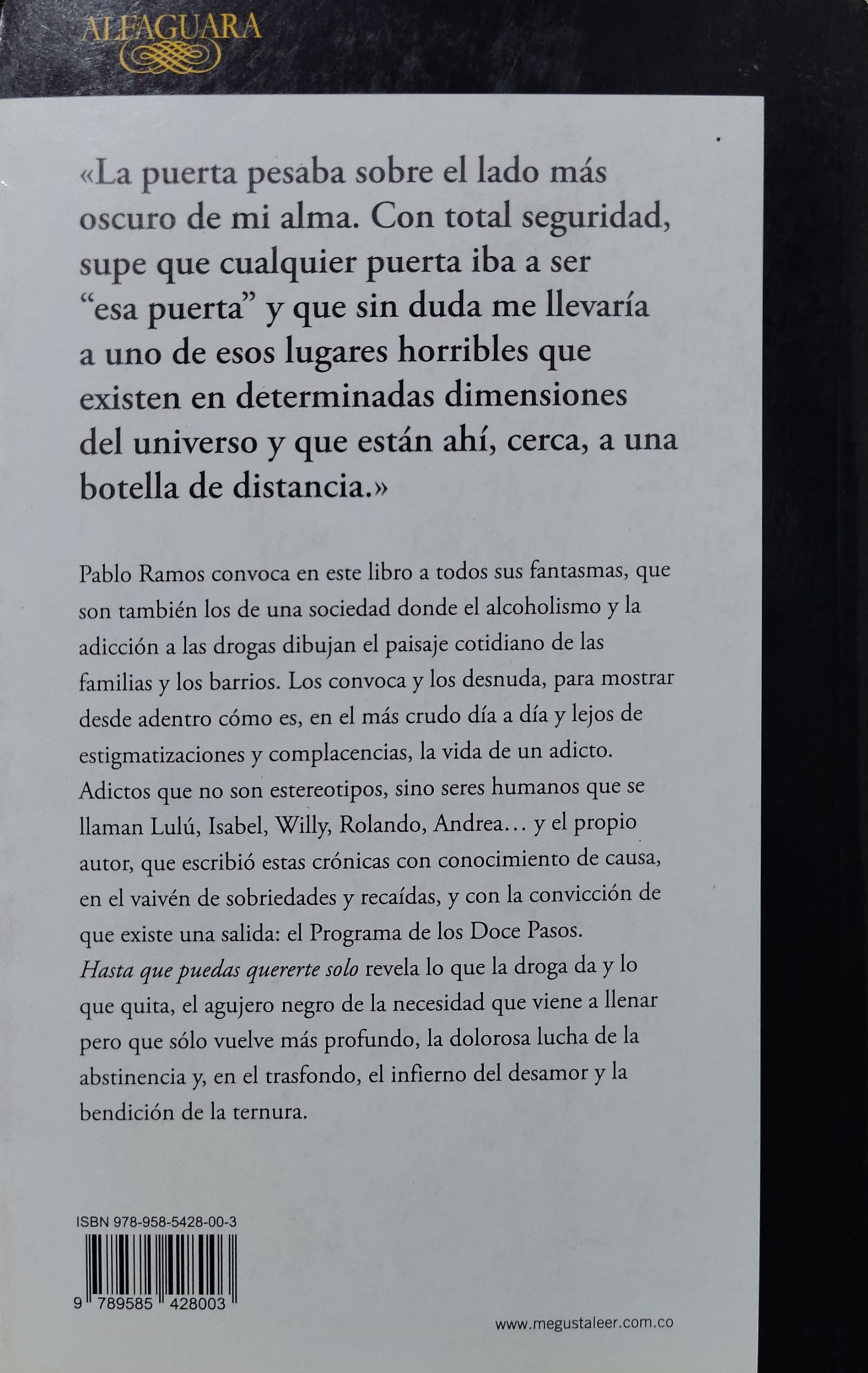 Hasta que puedas quererte solo Por Pablo Ramos ,«La puerta pesaba sobre el lado más oscuro de mi alma. Con total seguridad, supe que cualquier puerta iba a ser? "esa puerta" y que sin duda me llevaría a uno de esos lugares horribles que existen en determinadas dimensiones del universo y que están ahí, cerca, a una botella de distancia.» Pablo Ramos convoca en este libro a todos sus fantasmas, que son también los de una sociedad donde el alcoholismo y la adicción a las drogas dibujan el paisaje cotidiano de las familias y los barrios. Los convoca y los desnuda, para mostrar desde dentro cómo es, en el más crudo día a día y lejos de estigmatizaciones y complacencias, la vida de un adicto. Adictos que no son estereotipos, sino seres humanos que se llaman Lulú, Isabel, Willy, Rolando, Andrea... y el propio autor, que escribió estas crónicas con conocimiento de causa, en el vaivén de sobriedades y recaídas, y con la convicción de que existe una salida: el Programa de los Doce Pasos. Hasta que puedas quererte solo revela lo que la droga da y lo que quita, el agujero negro de la necesidad que viene a llenar pero que solo vuelve más profundo, la dolorosa lucha de la abstinencia y, en el trasfondo, el infierno del desamor y la bendición de la ternura.