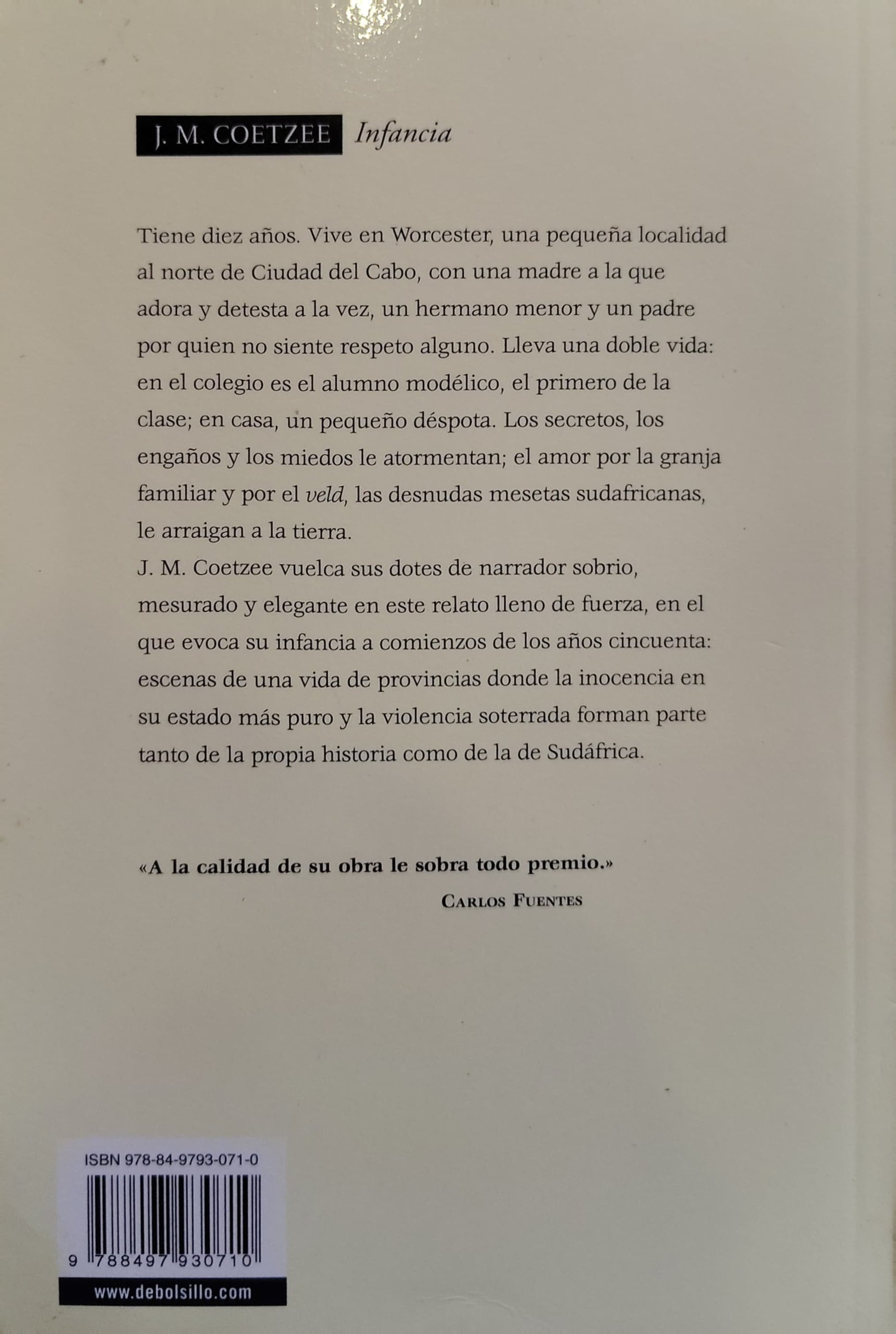 Tiene diez años. Vive en Worcester, una pequeña localidad al norte de Ciudad del Cabo, con una madre a la que adora y detesta a la vez, un hermano menor y un padre por quien no siente respeto alguno. Lleva una doble vida: en el colegio es el alumno modélico, el primero de la clase; en casa, un pequeño déspota. Los secretos, los engaños y los miedos le atormentan; el amor por la granja familiar y por el veld, las desnudas mesetas sudafricanas, le arraigan a la tierra. J.M. Coetzee vuelca su talento de narrador sobrio, mesurado y elegante en este relato lleno de fuerza, en el que evoca su infancia a comienzos de los años cincuenta; escenas de una vida de provincias donde la inocencia en su estado más puro y la violencia soterrada forman parte tanto de la propia historia como de la de Sudáfrica.Infancia es la primera parte de las memorias noveladas de J.M. Coetzee, que se completan con Juventud y Verano.