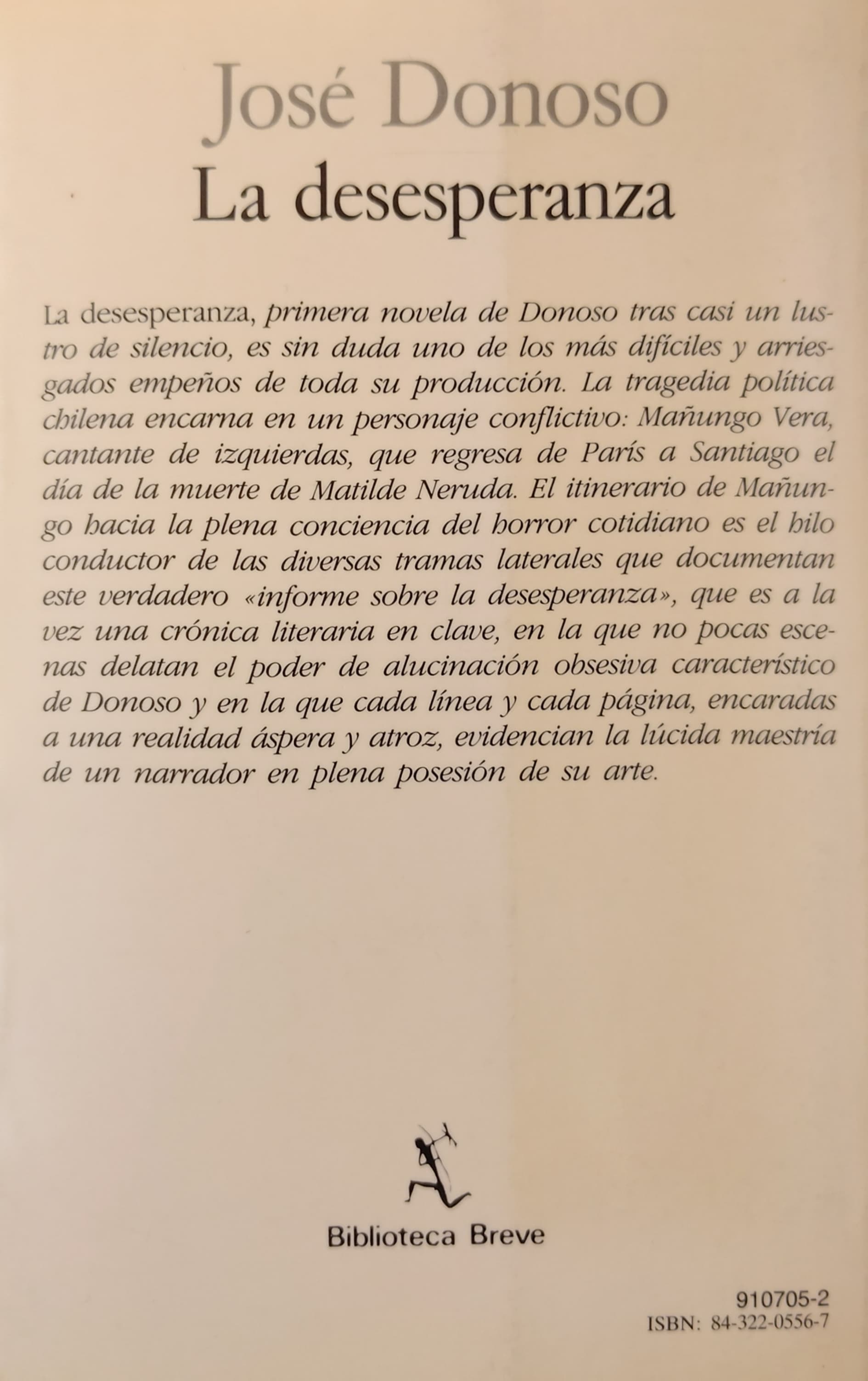 Finalmente, José Donoso terminó de escribir La desesperanza, novela donde mezcló sus experiencias vividas en la isla y un homenaje a Matilde Neruda, recién fallecida. Así, describió el autor su obra: "es probablemente la más realista de mis novelas y la más chilena. Es una novela que empieza en el despertar de Matilde, la esposa de Neruda, quien murió hace un año. La segunda parte de la novela es sobre una pareja y una excursión que hacen por Santiago, la que termina en el funeral de Matilde. Todo ocurre dentro de ocho horas, y bueno la novela tiene un sentimiento de gran urgencia. La novela tiene un significado que se vincula a la actual situación del país. Al mismo tiempo disfruté y sufrí escribiéndola" (Pereira, Amalia. "Interview with José Donoso", Latin American Literary Review, (30): 57-67, 1987).