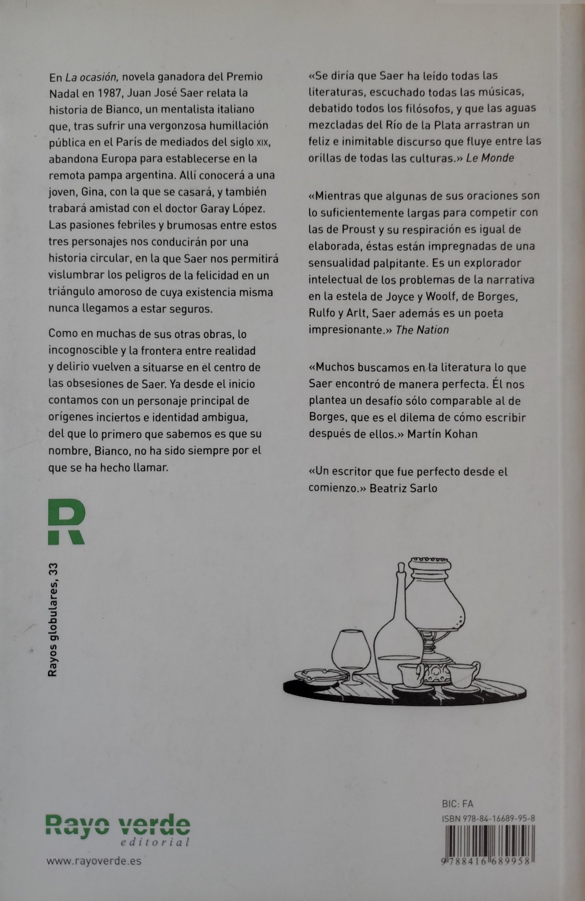 En la ocasión, novela ganadora del premio nadal en 1987, juan josé saer relata la historia de bianco, un mentalista italiano que, tras sufrir una vergonzosa humillación pública en el parís de mediados del siglo xix, abandona europa para establecerse en la remota pampa argentina. allí conocerá a una joven, gina, con la que se casará, y también trabará amistad con el doctor garay lópez. las pasiones febriles y brumosas entre estos tres personajes nos conducirán por una historia circular, en la que saer nos permitirá vislumbrar los peligros de la felicidad en un triángulo amoroso de cuya existencia misma nunca llegamos a estar seguros. como en muchas de sus otras obras, lo incognoscible y la frontera entre realidad y delirio vuelven a situarse en el centro de las obsesiones de saer. ya desde el inicio contamos con un personaje principal de orígenes inciertos e identidad ambigua, del que lo primero que sabemos es que su nombre, bianco, no ha sido siempre por el que se ha hecho llamar.