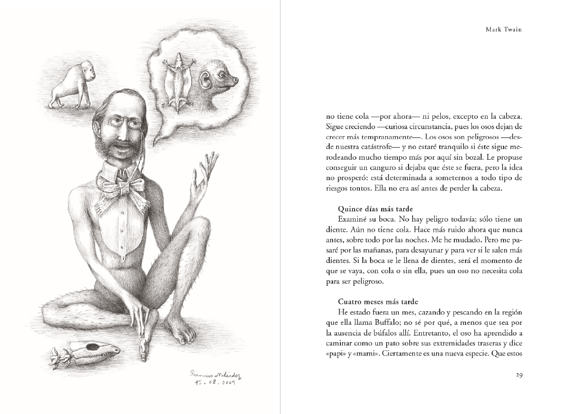 Al cumplirse en 2010 cien años de la muerte de Mark Twain, Libros del Zorro Rojo publicó una edición especial de Los diarios de Adán y Eva iluminada por el legendario dibujante Francisco Meléndez, figura esencial de la ilustración contemporánea en España; esta obra ahora se reedita para disfrute de los lectores en un nuevo formato.