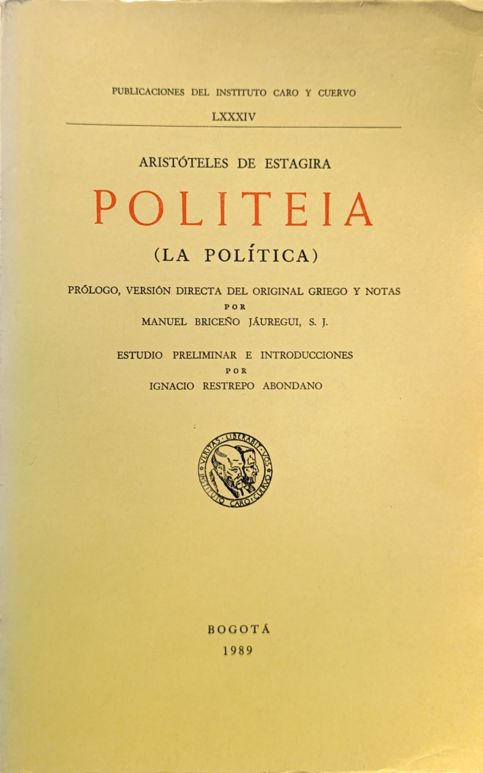 Aristóteles de Estagira, Politeia (La Política), prólogo, versión directa del original griego y notas por Manuel Briceño Jáuregui S. J. Estudio preliminar e introducciones por Ignacio Restrepo Abondano. Presentación de Alfonso Borrero S. J. Instituto Caro y Cuervo (Publicaciones del Instituto Caro y Cuervo, nº 84), Bogotá 1989, 685 págs.
