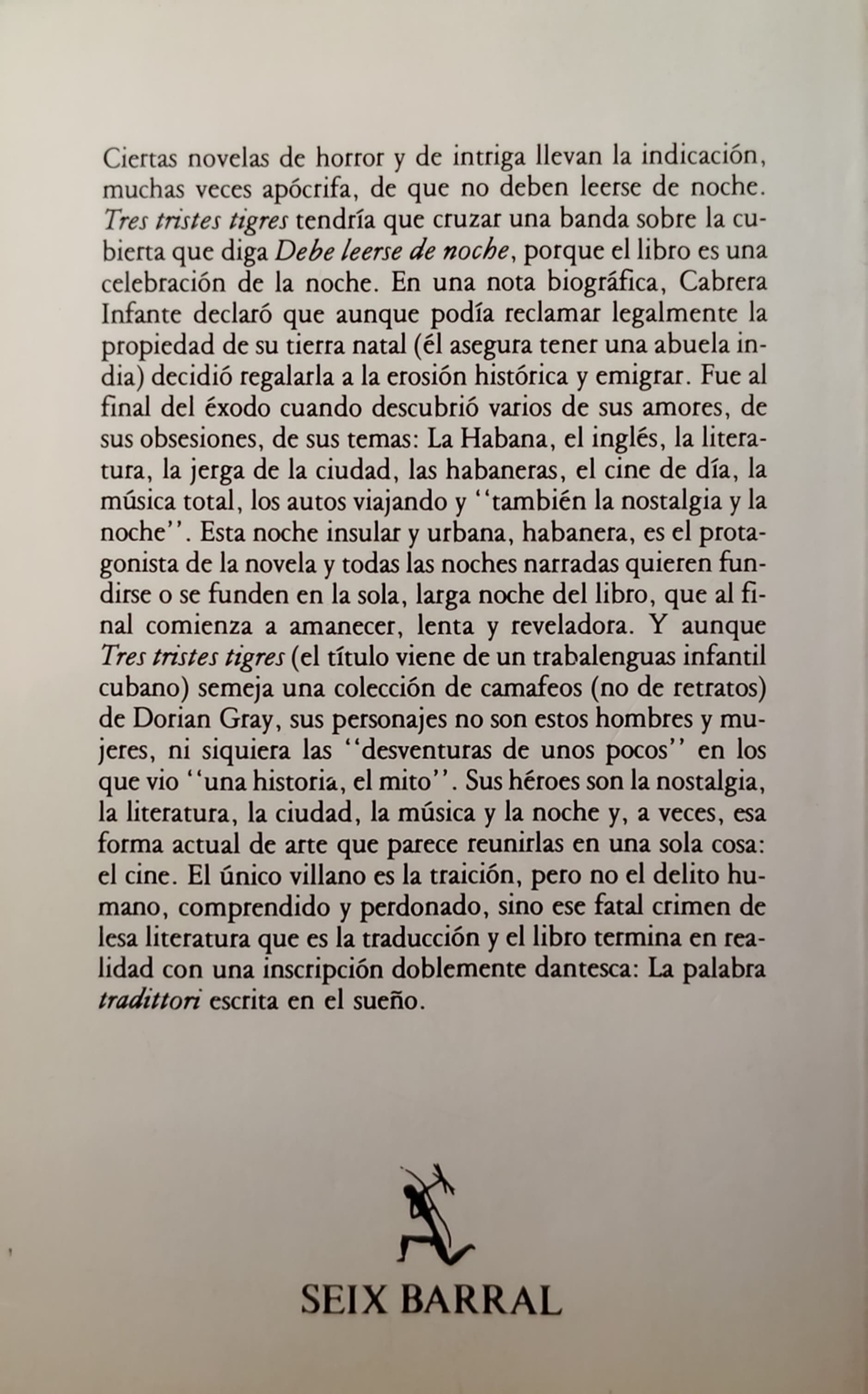 "Tres tristes tigres" es la novela más audaz del llamado "boom" hispanoamericano de los años sesenta, un hito esencial en la narrativa hispánica y una de sus mayores muestras en la tradición moderna y posmoderna. Publicada en 1967, año clave en la historia del "boom", coincide con "Cien años de soledad", representa dentro de ese cuerpo de por sí experimental un experimento mayor con el lenguaje, con las estructuras narrativas y con la imaginación literaria. El texto escrito, según Cabrera Infante, "en cubano", que no en español, se caracteriza por sus abundantes juegos de palabras que parten del relajo o humor típico del pueblo cubano. "Tres tristes tigres" es, en palabras de su autor, "una galería de voces, casi un museo del habla cubana, en la que generaciones por venir podrían oír hablar a sus ancestros". Una recreación nostálgica de La Habana de 1958, y en especial de su vida nocturna. Un canto a la ciudad, que recrea y mitifica, rescribiendo la "historia" de la cultura habanera.